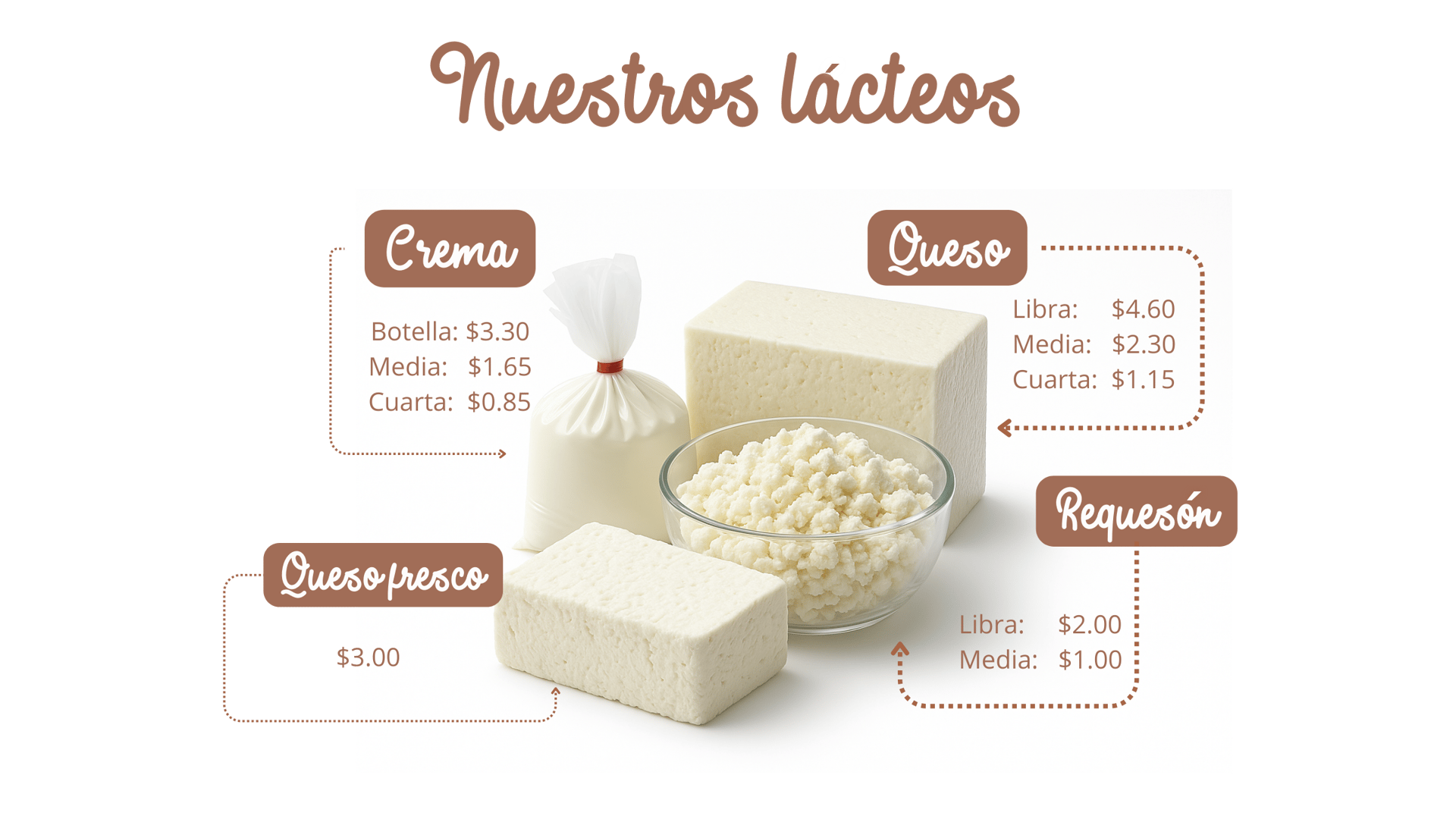 En Panadería San Antonio’s contamos con una selección de lácteos de calidad, elaborados para brindar sabor auténtico y frescura en cada presentación. Ofrecemos leches, quesos, crema y requesón, pensados para acompañar tus comidas y mantener el gusto tradicional que distingue a nuestros productos.