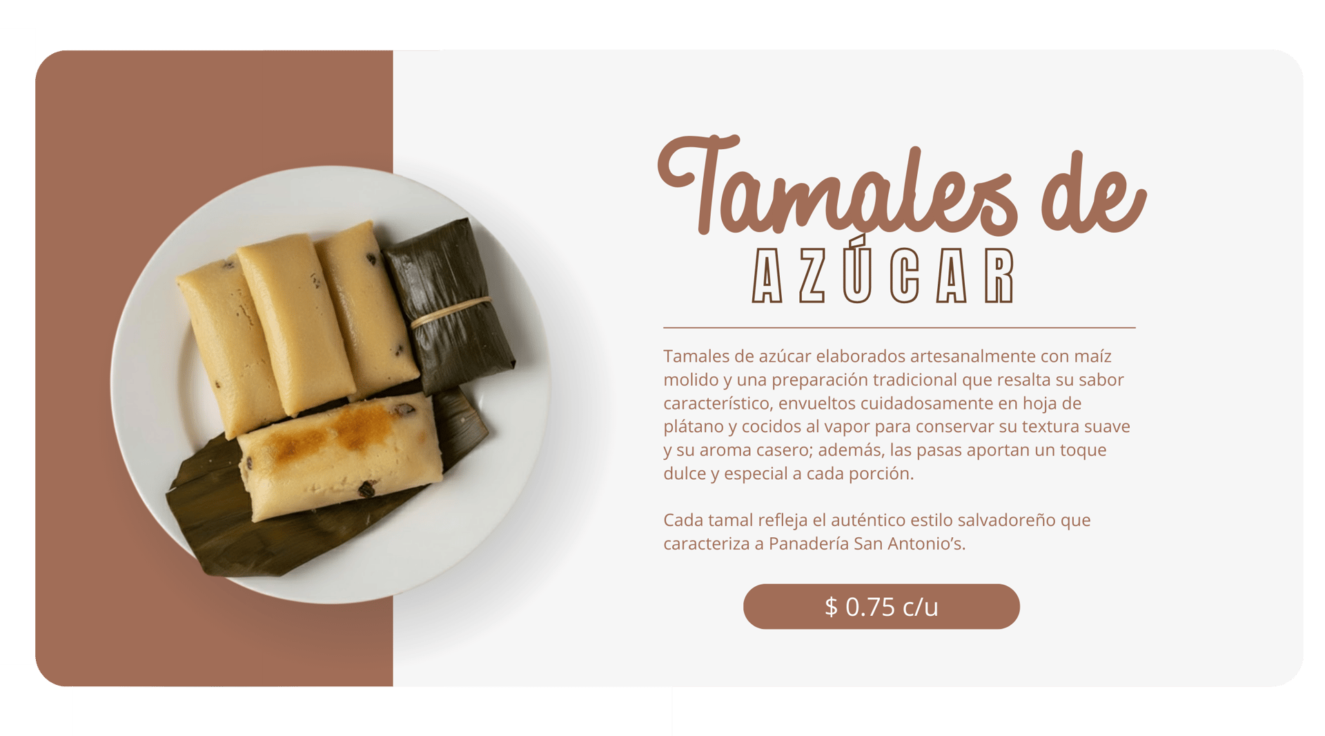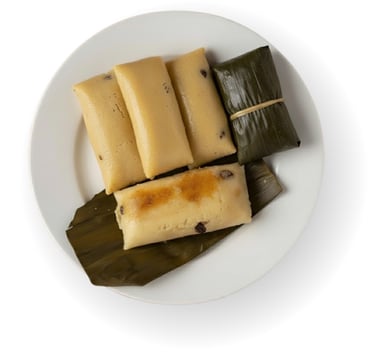 Tamales de azúcar elaborados artesanalmente con maíz molido y una preparación tradicional que resalta su sabor característico, envueltos cuidadosamente en hoja de plátano y cocidos al vapor para conservar su textura suave y su aroma casero; además, las pasas aportan un toque dulce y especial a cada porción.