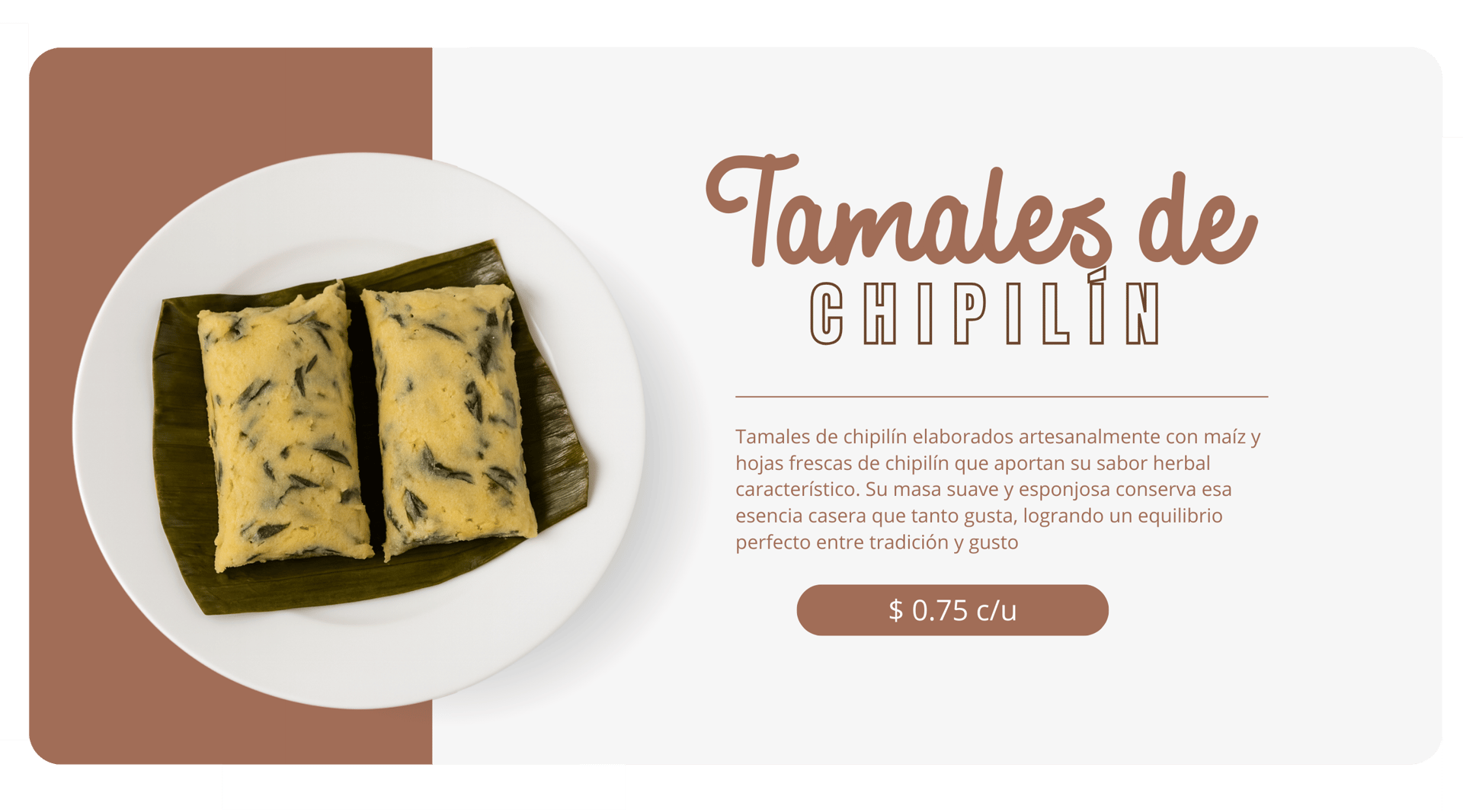 Tamales de chipilín elaborados artesanalmente con maíz y hojas frescas de chipilín que aportan su sabor herbal característico. Su masa suave y esponjosa conserva esa esencia casera que tanto gusta, logrando un equilibrio perfecto entre tradición y gusto